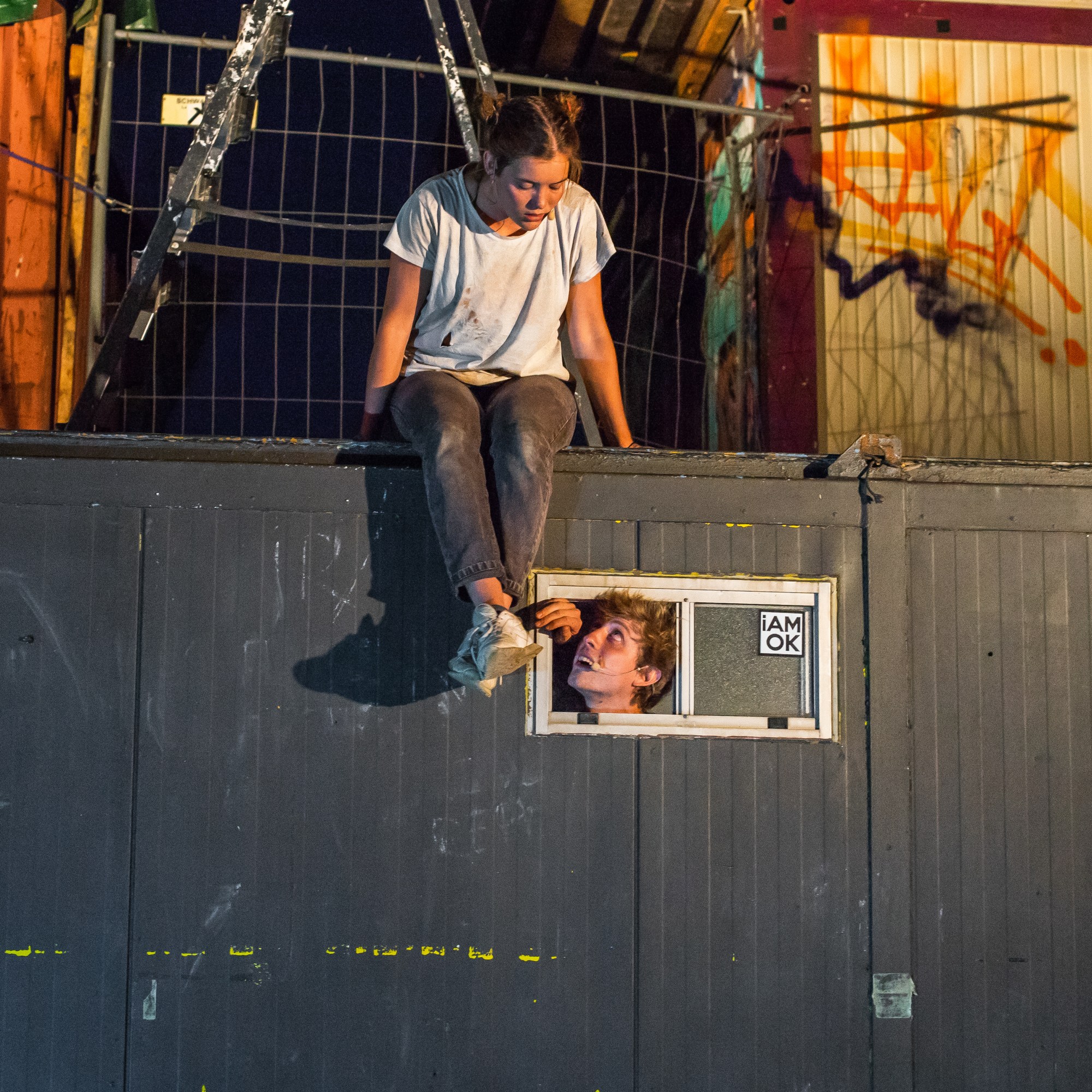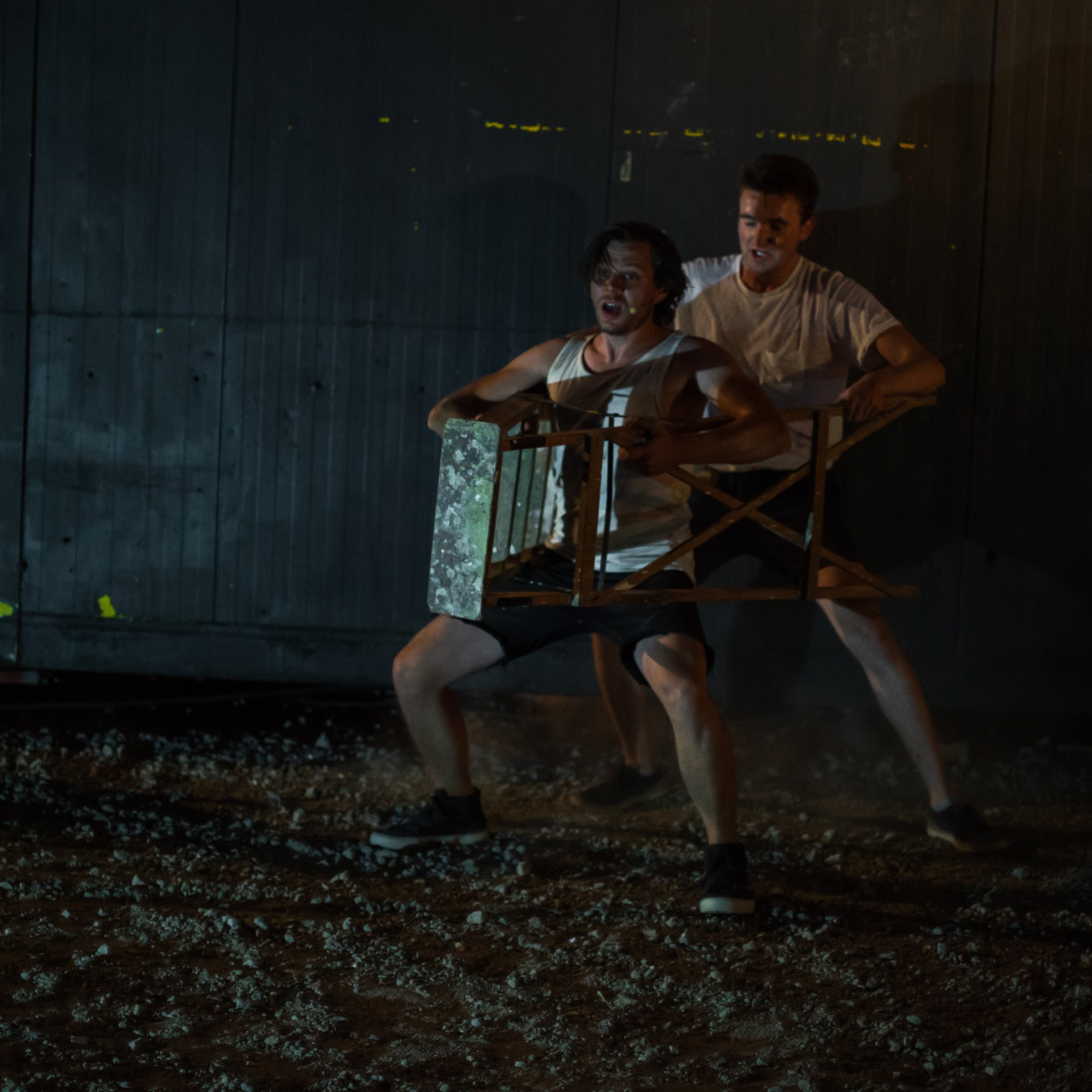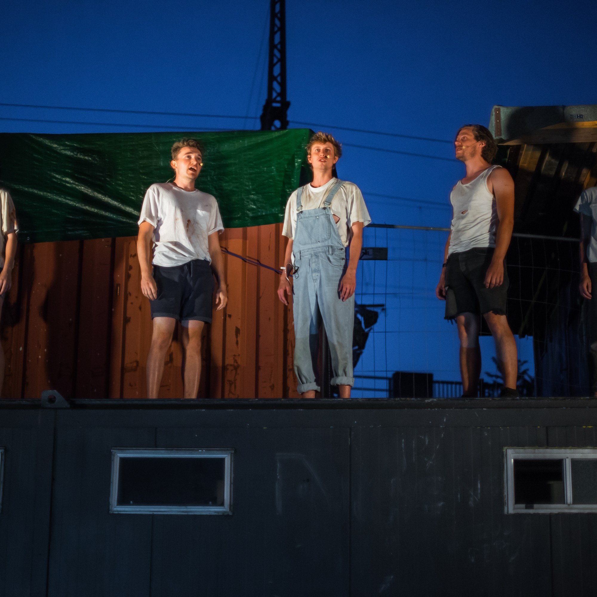 Durch die Open-Air Situation und dem Lageort zwischen Spree, Straße und Club ist die Stadt immer anwesend. Die Inszenierung ist eine anarchische Aneignung eines Transitraumes – wie auch in der Antigone-Überschreibung, die den Fokus auf das Dazwischen, den Durchgang, die Geschwister- beziehung legt. Die Zeit dehnt sich und aus unterschiedlichen Perspektiven wird der Moment vor dem Doppelmord der Brüder beleuchtet und die Frage durchgespielt, was Verrat an der Familie bedeutet.