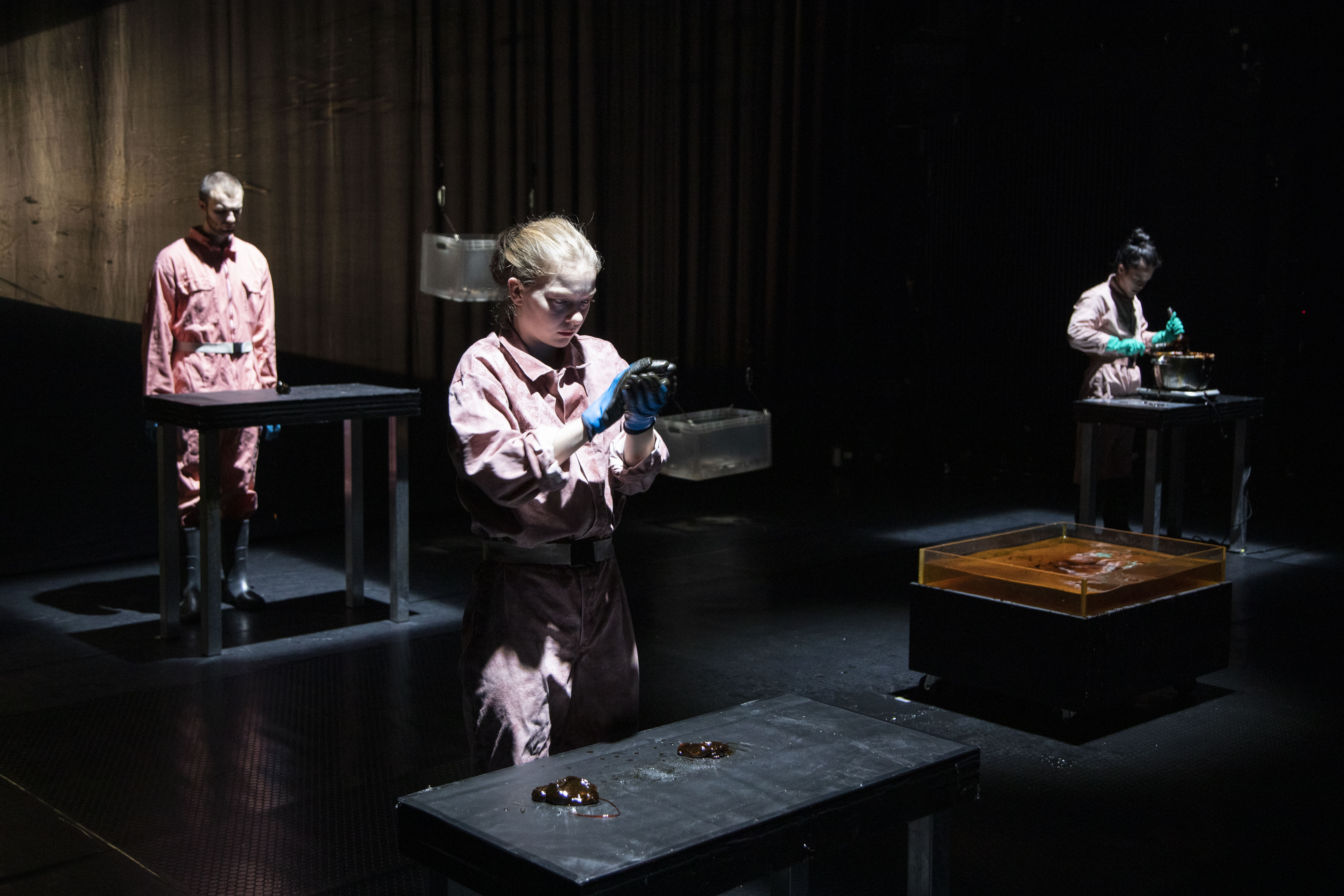 Drei Figuren arbeiten. Die Masse zerrinnt in ihren Händen. Immer gleiche Wege, immer gleiche Schritte, ein vermeintlich unveränderbares System. Figuren, die sich in die Einsamkeit zurückziehen und zugleich aus der Isolation ausbrechen wollen. Figuren, die sich brauchen, sich nahe sein wollen und sich dennoch fliehen und die Verantwortung füreinander von sich weisen.